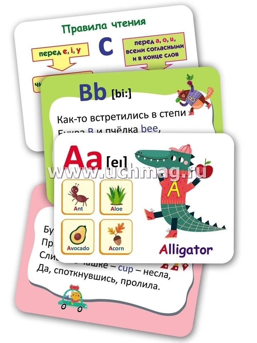 В комплект входит 30 карточек: из них, 26 карточек с буквами английского алфавита, где на лицевой стороне карточки красочное изображение буквы, её транскрипции и слов с картинками, начинающиеся на эту букву, на оборотной стороне - стихотворение, и 4 карточки с правилами чтения букв.