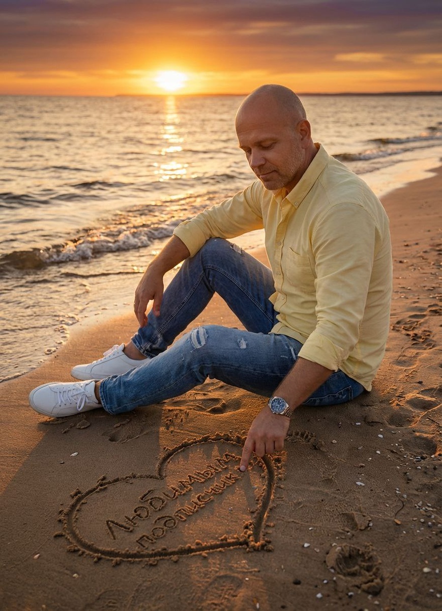 загруженного изображения для точной передачи лица и прически. Одежда: Он одет в современный западный стиль — повседневную легкую желтую рубашку в сочетании с синими потертыми джинсами и белыми стильными кроссовками. Сидя на песке у берега, он нежно рисует пальцем сердце. Внутри сердца написано кириллицей имя «любимым подписчикам». Его взгляд спокоен и задумчив, отражая тихий, романтический момент, когда волны мягко приближаются к берегу. Фон: Сцена разворачивается на фоне теплого золотистого заката, свет мягко отражается на песке и воде. Легкий морской бриз, едва заметные волны и кинематографические оттенки оранжевого и золотого усиливают эмоциональную, спокойную атмосферу приморского курорта, вызывая чувство ностальгии и искреннего умиротворения ❤️ Ставьте реакции! 👉Все ссылки ТУТ 👉канал в Дзен 💰Donate
