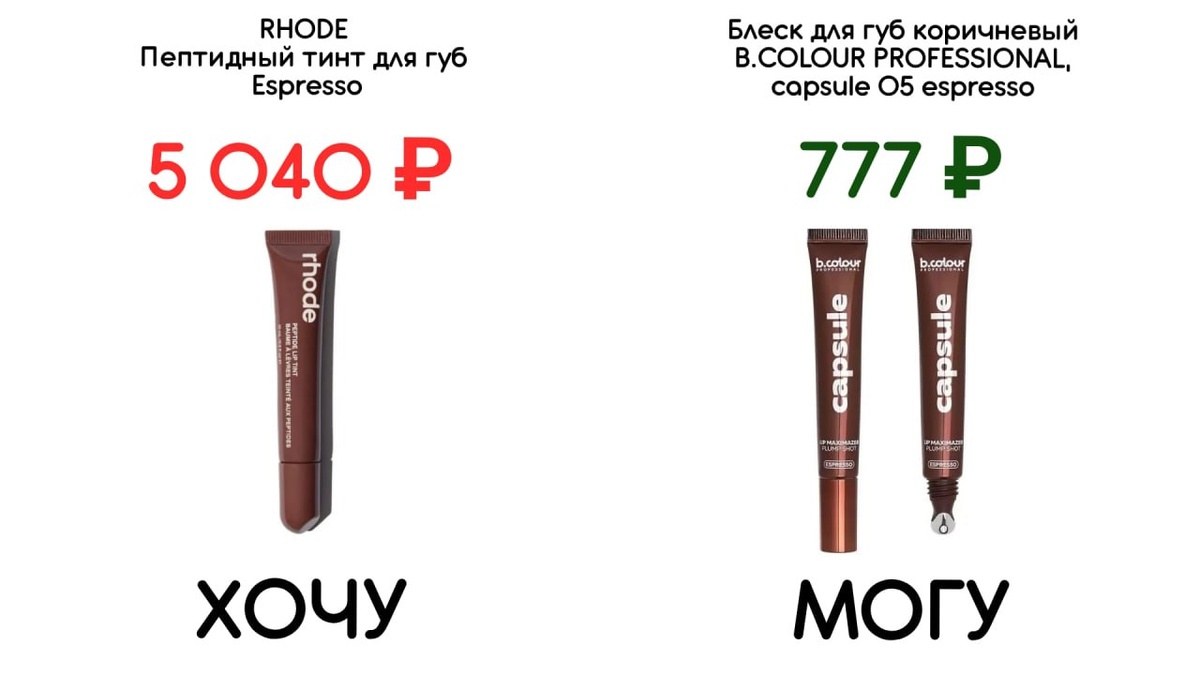 Блеск-тинт – это «гибридное» средство, которое сияет, как блеск, но держится так же хорошо, как тинт. Оно подойдет девушкам, у которых быстро «съедается» помада или обычный блеск растекается по морщинкам вокруг губ. ❗️В блеске RHODE есть небольшое количество пептидов, то есть таких веществ, которые посылают в кожу сигнал о необходимости восстановления. Конечно, такие средства не могут заменить базовый уход за нашими губками, но полезных веществ много не бывает, поэтому зимой и осенью я стремлюсь, чтобы даже декоративные средства для губ содержали увлажняющие и питательные компоненты! Блеск красивого кофейного оттенка можно использовать даже для достаточно строгих образов на каждый день: если розовый блеск выглядит «по-девичьи», то коричневый кажется более благородным и сдержанным. Хочу: RHODE Пептидный тинт для губ Espresso, цена – 5 040 рублей Могу: Блеск для губ коричневый B.COLOUR PROFESSIONAL, бальзам capsule 05 espresso. Цена – 777 рублей
