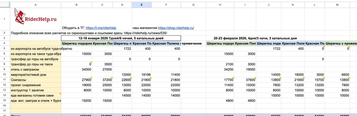 Мы написали большой материал со сравнением цен в Красной Поляне и в Шерегеше. Почему написали? В последние пару лет многие катальщики, которые бывают и там, и там, говорят о существенном росте цен в Шерегеше. С ними отчаянно спорят оппоненты, которые считают, что Поляна «в разы», а то «и на порядок» дороже. Потом дискуссия довольно быстро перерастает в срач и оскорбления типа «вы все врёти» и «ну и катайтесь у себя в (нужное подставить)». Поэтому давайте просто попробуем сравнить сухие цифры и сравнить базовые расходы на поездку в оба региона на одни и те же даты. Материал мы написали 21 декабря 2025 г, все цены и скриншоты актуальны на эту дату. Поездку будем считать на 2х человек (стандартный номер в отеле), чтобы было проще. Материал очень большой, читать долго, но он довольно подробный и с пруфами. Я старался везде оставлять ссылки и скриншоты, чтобы вам было проще сравнить. А нему прилагается табличка, в которой тоже надо разобраться. Оформлено местами не очень красиво, но у м