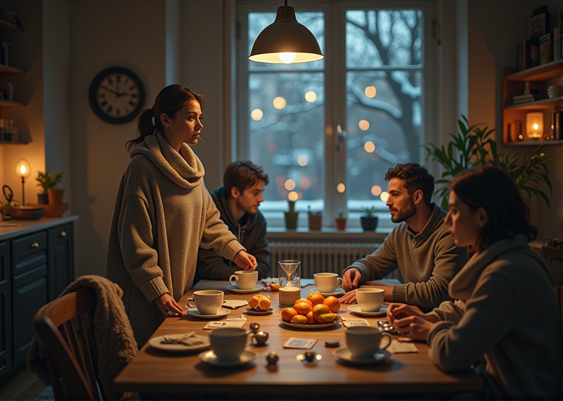 Снег лип к стеклу крупными хлопьями, как будто кто‑то снаружи осторожно прикладывал к окну белые ладони. На кухне пахло мандаринами, корицей и чуть подгоревшей карамелью — Дима снова «спасал» глинтвейн, уверяя, что так и задумано. На столе, среди тарелок с сыром и виноградом, лежали карточки «Мафии», бумажные маски и маленький песочный таймер, который Лера привезла «как в кино».
