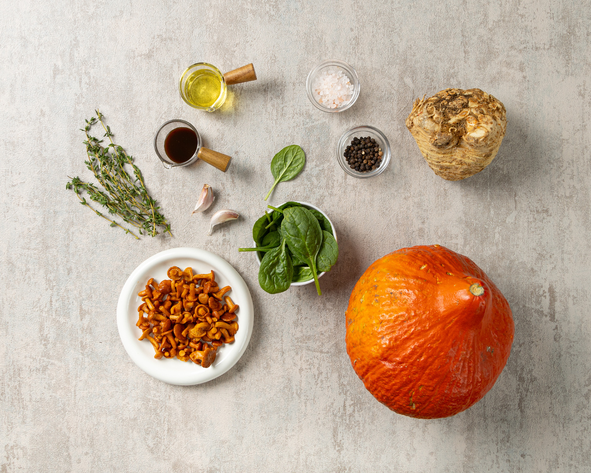 Блюдо, собранное по принципу mise en place: каждый элемент готовится отдельно, а в финале соединяется в цельную, глубокую композицию вкуса. Основа • Мини-тыквы — 2 шт. (или 1 среднего размера) • Оливковое масло — для жарки и запекания • Fleur de sel (или морская соль) — по вкусу • Чёрный перец — по вкусу Начинка из овощей и грибов • Пастернак — 100 г • Корень сельдерея — 100 г • Белые грибы (свежие) — 100 г • Лисички (свежие) — 100 г • Шпинат — 50 г • Чеснок — 1 зубчик • Тимьян — 1 веточка • Оливковое масло — для жарки Подготовка тыквы 1. Срезаем верхушки мини-тыкв — это будут «крышечки». Ложкой аккуратно удаляем семена и волокна. 2. Тыквы смазываем оливковым маслом, слегка солим, внутрь при желании кладём веточку тимьяна. Запекаем в Грандшефе на режиме Bake при 180°C в течение 30 минут (до мягкости, ориентируйтесь на свой размер тыкв). Начинка для тыквы 1. Все овощи и грибы нарезаем мелким или средним кубиком. 2. Каждый ингредиент обжариваем на оливковом масле с веточкой тимьяна и неб