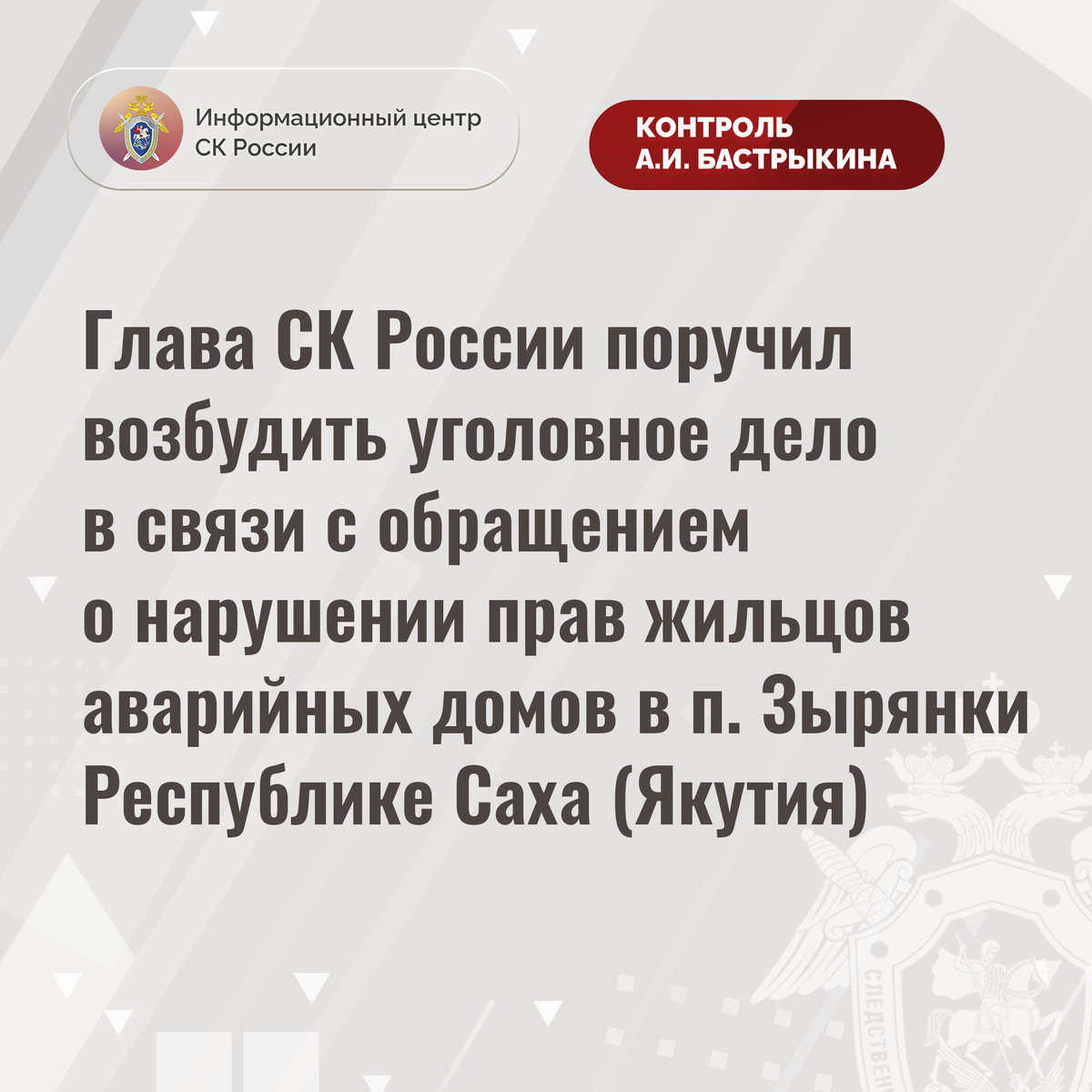 Глава СК России поручил возбудить уголовное дело в связи с обращением о нарушении прав жильцов аварийных домов в п. Зырянки Республике Саха (Якутия) В Информационный центр СК России поступило обращение жителей поселка Зырянка Республике Саха (Якутия) по вопросу нарушения их жилищных прав. Несмотря на то, что несколько многоквартирных домов ввиду высокой степени физического износа, неисправности инженерных систем и разрушений несущих конструкций признаны аварийными, до настоящего времени граждане благоустроенными жилыми помещениями не обеспечены. В связи с небезопасными условиями проживания профильные структуры принуждают жильцов покинуть занимаемые квартиры без предоставления жилплощади взамен. Многочисленные обращения в различные инстанции результатов не принесли. В СУ СК России по Республике Саха (Якутия) организована процессуальная проверка. Председатель Следственного комитета Российской Федерации Александр Иванович Бастрыкин поручил и.о. руководителя СУ СК России по Республике Сах