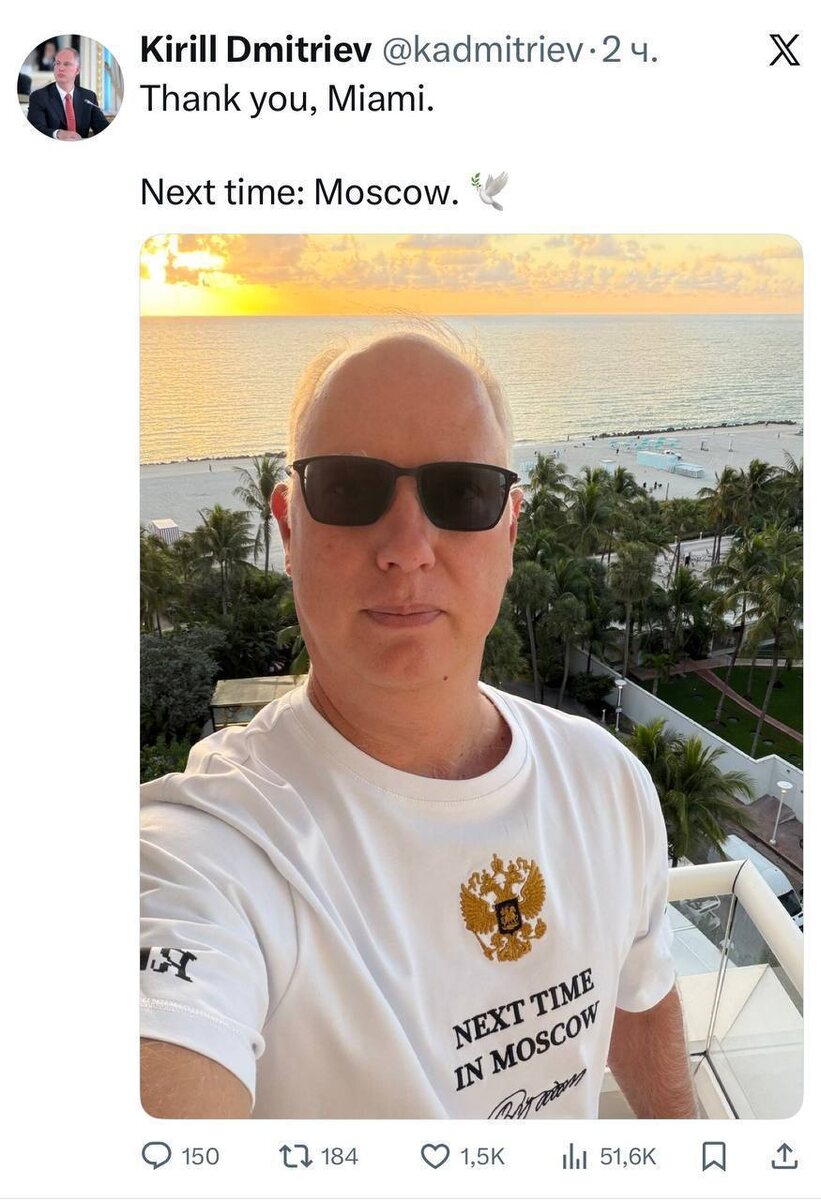 Привет из Майами передаёт спецпредставитель президента РФ Кирилл Дмитриев. Судя по надписи на футболке — настрой оптимистичный🤞