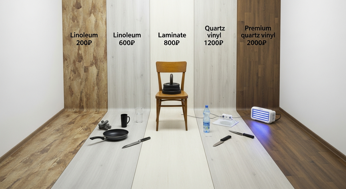 Купил образцы 5 популярных покрытий — от самых дешёвых до премиальных. Тестировал 3 года в реальных условиях: укладка в коридоре (проходная зона), падения тяжестей, царапины, вода, солнце.