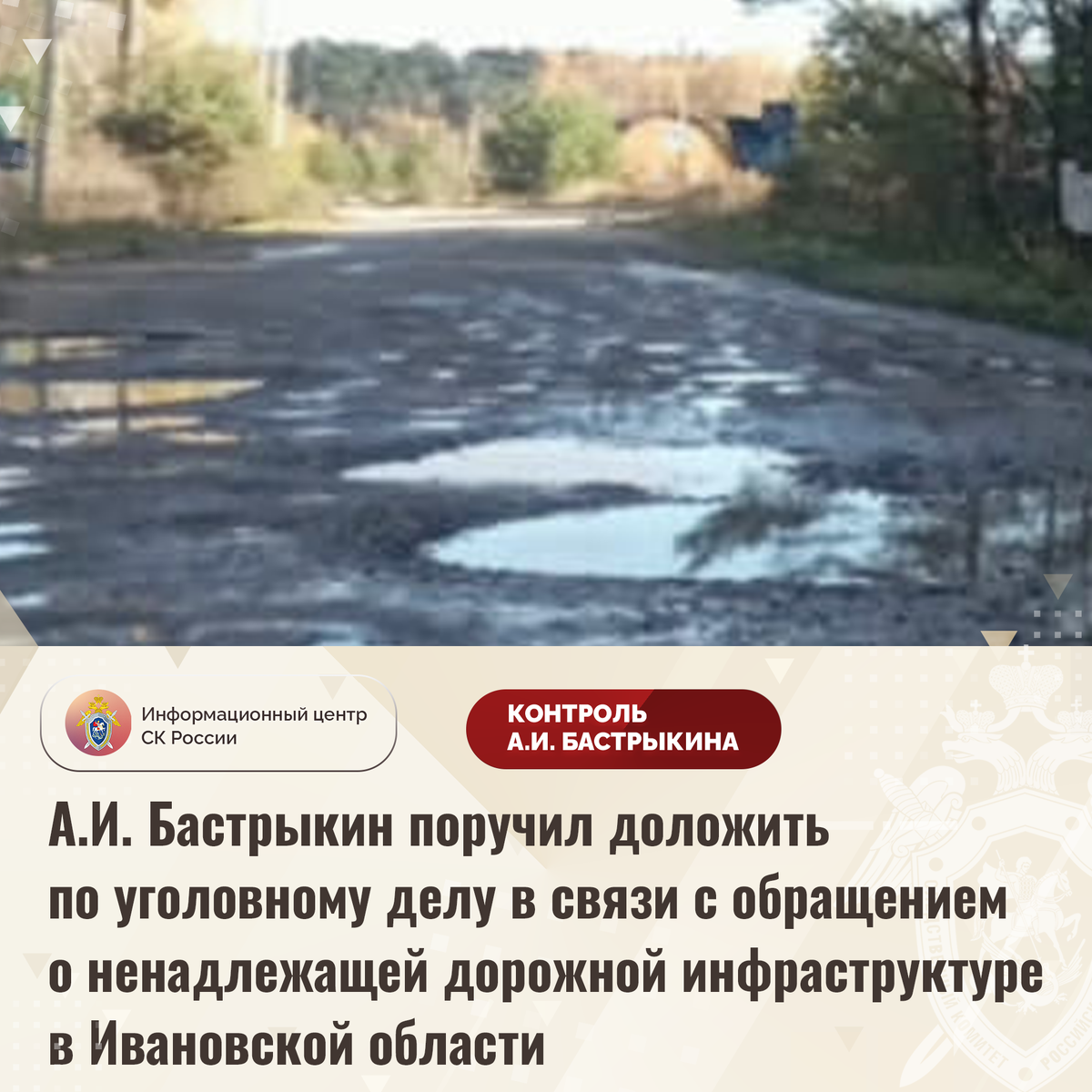 А.И. Бастрыкин поручил доложить по уголовному делу в связи с обращением о ненадлежащей дорожной инфраструктуре в Ивановской области