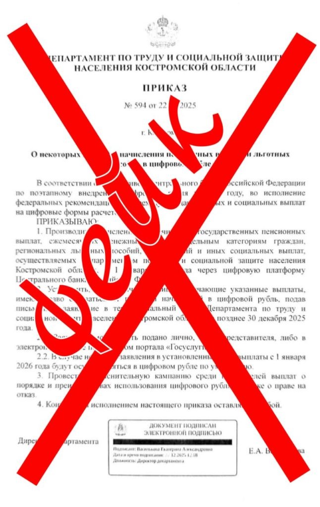 В соцсетях распространяется фейковый приказ депсоцзащиты Костромской области об использовании для выплат цифрового рубля