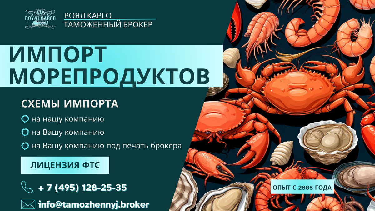 Импорт морепродуктов — одно из самых сложных и одновременно востребованных направлений внешнеэкономической деятельности. Рыба, креветки, мидии, кальмары, крабы, осьминоги и другие дары моря ежедневно ввозятся в Россию для розничной торговли, ресторанного бизнеса и пищевой промышленности. При этом любая ошибка на этапе таможенного оформления может привести к задержкам, штрафам, порче скоропортящегося груза и серьезным финансовым потерям. Как таможенный брокер с практическим опытом работы с пищевой продукцией, мы сопровождаем импорт морепродуктов "под ключ": от подбора кодов ТН ВЭД до прохождения ветеринарного контроля и выпуска товара. Уже на этапе планирования поставки Вы можете получить бесплатную консультацию или расчет стоимости доставки и таможенного оформления. Правильный подбор кода ТН ВЭД — ключевой момент при импорте морепродуктов. От него зависят ставки пошлин, НДС, необходимость разрешительных документов и формат ветеринарного контроля. Основные группы ТН ВЭД: • 0301 — живая