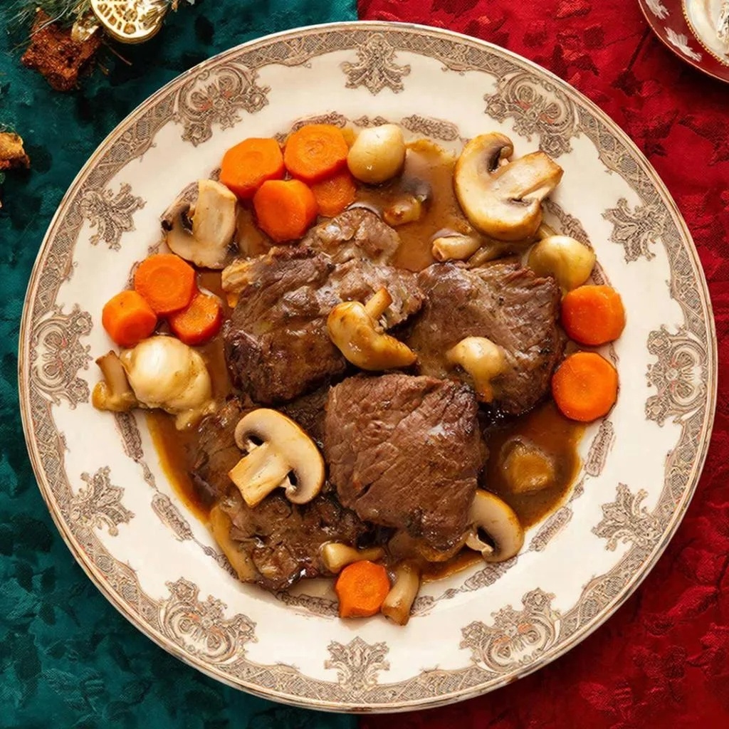 Беф-бургиньон— это классическое французское рагу из мяса, тушённого в красном вине с луком, морковью и грибами. Его родина — Бургундия, регион, славящийся и своим вином, и своей кухней. Это блюдо крестьянских корней: когда-то так готовили более жёсткие, «рабочие» куски мяса, чтобы сделать их мягкими и сочными. Длительное томление в вине и бульоне превращает любой скромный лопаток или шею в деликатес с богатым, глубоким вкусом.