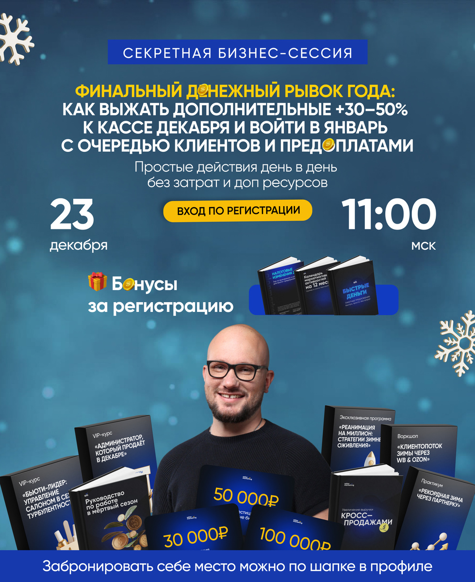 Экстренное включение для владельцев салонов👇 Мы вообще-то готовили его только для нашего закрытого сообщества — но решили открыть доступ и для вас, потому что верим в магию праздника, и не хотим, чтобы кто-то оставался без икры на новый год. 23 декабря в 11:00 МСК — секретная онлайн бизнес-сессия: «Финальный денежный рывок года» Как выжать дополнительные +30–50% к кассе декабря и войти в январь с очередью клиентов и предоплатами. И главное: простые действия, которые можно внедрить день в день без доп затрат, рекламы и соцсетей. Что будет на эфире: ✅ Где в салоне уже лежат +30-50% к кассе, которые 90% владельцев не замечают — на тех же ресурсах и потоке клиентов ✅ 5 механик: как зарабатывать больше на том же потоке клиентов ✅ Как превратить последнюю неделю декабря в деньги января. Закрываем декабрьских клиентов так, чтобы они оставляли предоплаты на январь. ✅ Как продлить ажиотаж декабря на весь январь без скидок и демпинга 🎉Регистрация открыта (для участников так же есть праздничн