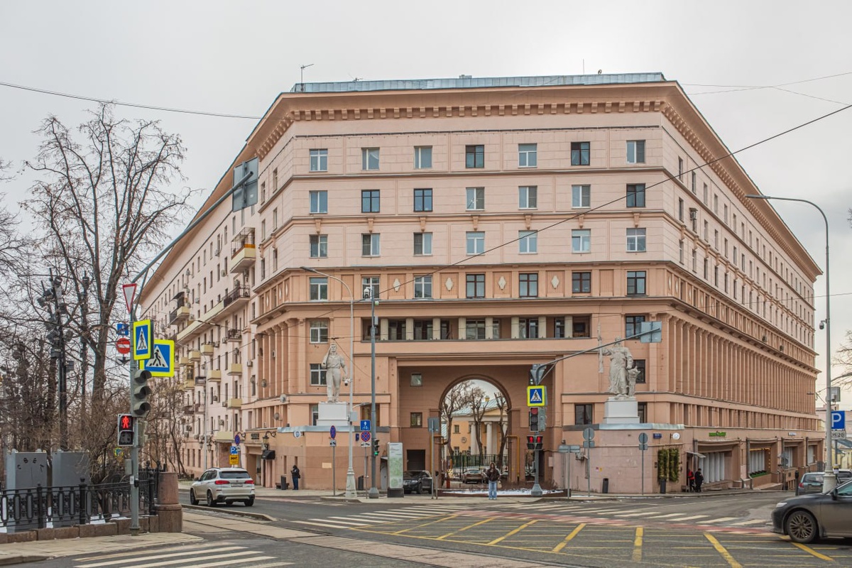 На фоне этого здания снимали эпизоды советских фильмов «Покровские ворота» и «Холодное лето пятьдесят третьего» Это дом Военно-инженерной академии имени Куйбышева, построенный в конце 1930-х. Автор проекта – архитектор Илья Голосов. Монументальное строение относят к стилю постконструктивизм. У него есть черты, характерные для сталинского ампира. Например, колонны, массивные резные карнизы и статуи. Во двор дома ведёт портал с аркой, который украшают скульптуры авторства Алексея Зеленского. Поэтому второе название здания – «дом с фигурами». Мужская фигура с отбойным молотком в одной руке и книгой в другой олицетворяет собой «Промышленность». А женская фигура со снопом колосьев у ног – «Сельское хозяйство». В руках у женщины винтовка – намёк на то, что собранный урожай она готова защищать. Очевидно, такими должны были быть идеальные советские люди. За аркой, во дворе, скрывается ещё один примечательный памятник архитектуры – усадьба Хитрово первой половины XIX века. 📍Подколокольный пер