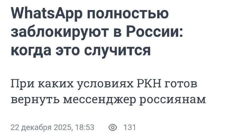 WhatsApp* будет полностью заблокирован в России, если он продолжит игнорировать требования законодательства. РКН намерен и дальше душить WhatsApp*, об этом СМИ сообщило само ведомство. Роскомнадзор заявил, что сервис продолжает игнорировать требования, которые направлены на предупреждение и пресечение совершения преступлений на территории России. CtrlAltDelights- подписаться
