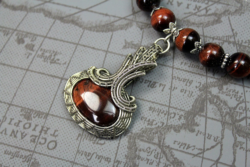 Ожерелье с кулоном из проволоки нейзильбер и камня Бычий глаз ручной работы в технике Wire wrap. Мастерская: Рукодел. Автор: Валерий Воробьев.