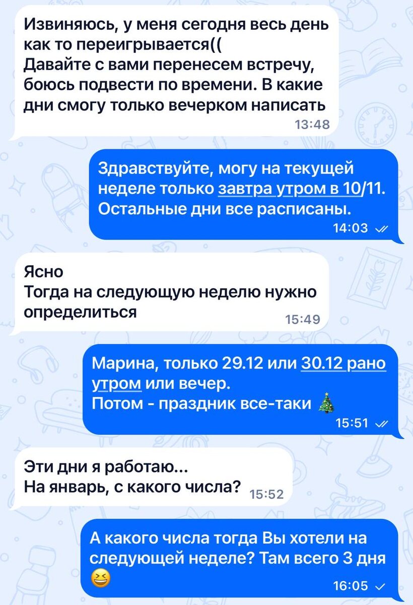 … А вы знаете как нам, риелторам, непросто? Рабочий день месяц ГОД у нас не-нор—мир-ванный 😆😆😆 Скрин переписки с клиентом в cian Сегодня дважды меняли время с вечера на утро, опять на вечер, потом отмена. Я честно старалась подстроиться. В итоге, похоже на 31 декабря планируем 🎄 Мне бы елку нарядить до праздника и вкусный стол успеть приготовить 🤩 #шуткадня #новыйгодкнаммчится