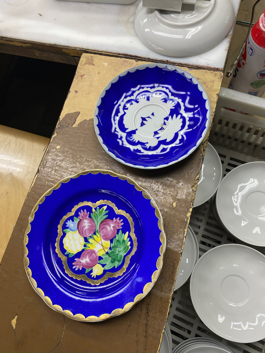В живописном цеху нам показали, как художники наносят рисунки на посуду. Оказывается, сначала декор переносится на тонкую бумагу. По краю рисунка много мелких дырочек. Эту кальку размещают на блюдце, присыпают чем-то вроде угольного порошка, и на фарфоре остается след. Художник его заполняет краской, а при обжиге остатки этого порошка просто выгорают.