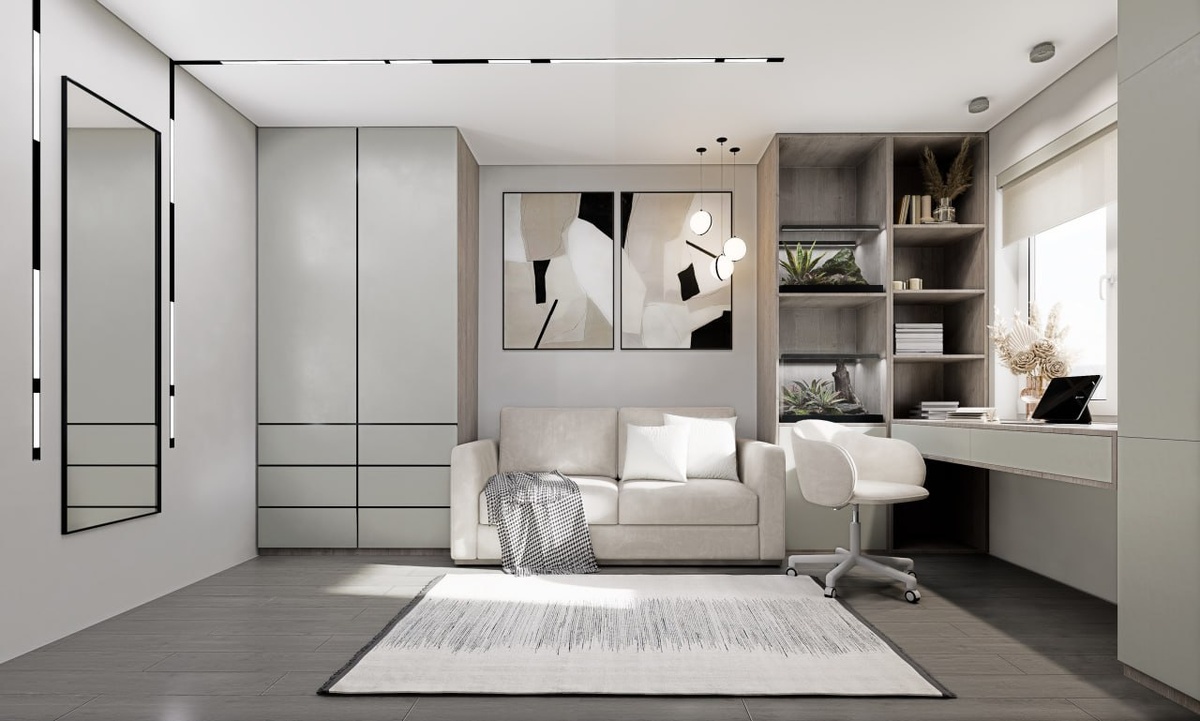 У окна расположена рабочая зона, где достаточно света для учёбы и творчества, а рядом предусмотрено место для террариумов — здесь живут небольшие питомцы 🦎 Диван легко превращается в кровать, а система хранения расположена так, чтобы не «съедать» пространство и не загромождать комнату. Минимум декора, максимум комфорта — в этом и есть идеальный баланс для молодой хозяйки. #ремонтподключ #дизайнпроект #интерьер #советыдизайнера #ремонт