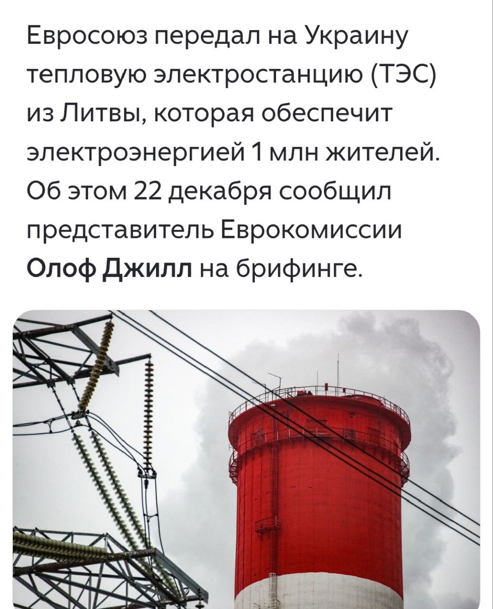 ❗️ Евросоюз передал на Украину тепловую электростанцию (ТЭС) из Литвы, которая должна обеспечить потребности 1 миллиона потребителей