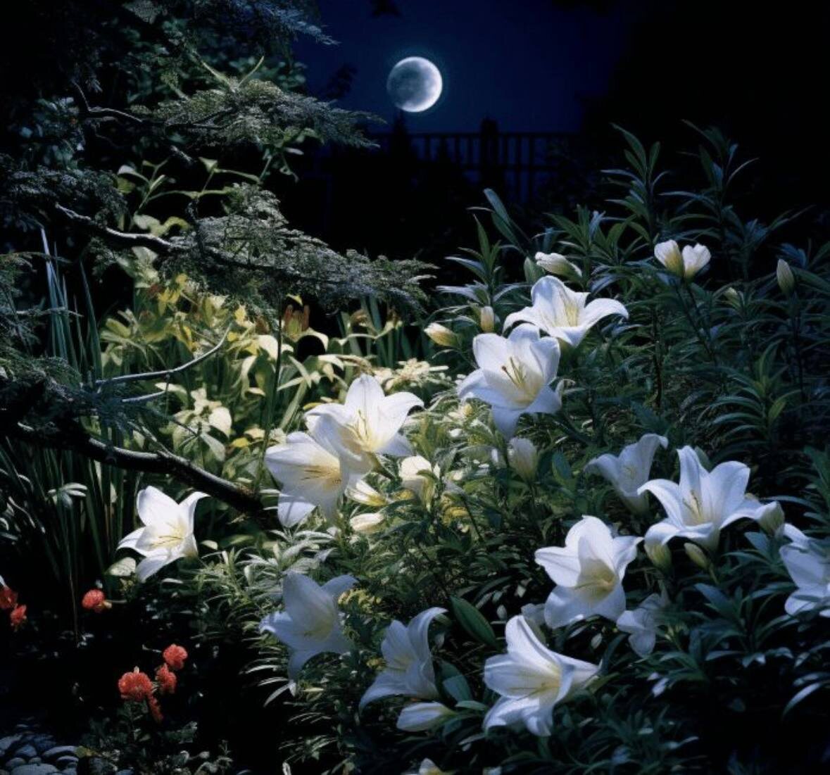 Сад — это не только место для цветов и прогулок днём. Есть особые сады, которые раскрываются по-настоящему ночью, под серебристым светом луны. Их называют лунными садами. В таком саду каждый вечер становится немного магическим: мягкое сияние отражается в белых цветах, серебристых листьях и воде, а ароматы ночных цветов создают ощущение спокойствия и волшебства. Как создаётся лунный сад Главная идея лунного сада — сделать пространство красивым и уютным ночью, когда большинство растений спят. Для этого тщательно подбираются растения и декоративные элементы. Белые и светлые цветы — основа любого лунного сада. Они отражают свет и создают эффект свечения, который особенно хорошо виден в сумерках и под луной. Среди них — белые розы, ирисы, лилейники, флокс, жасмин. Многие из них усиливают аромат именно ночью, превращая прогулку по саду в настоящее наслаждение для всех органов чувств. Ночной жасмин, садовый жасмин и ночная фиалка — яркие представители таких растений. Серебристые и светлые лис