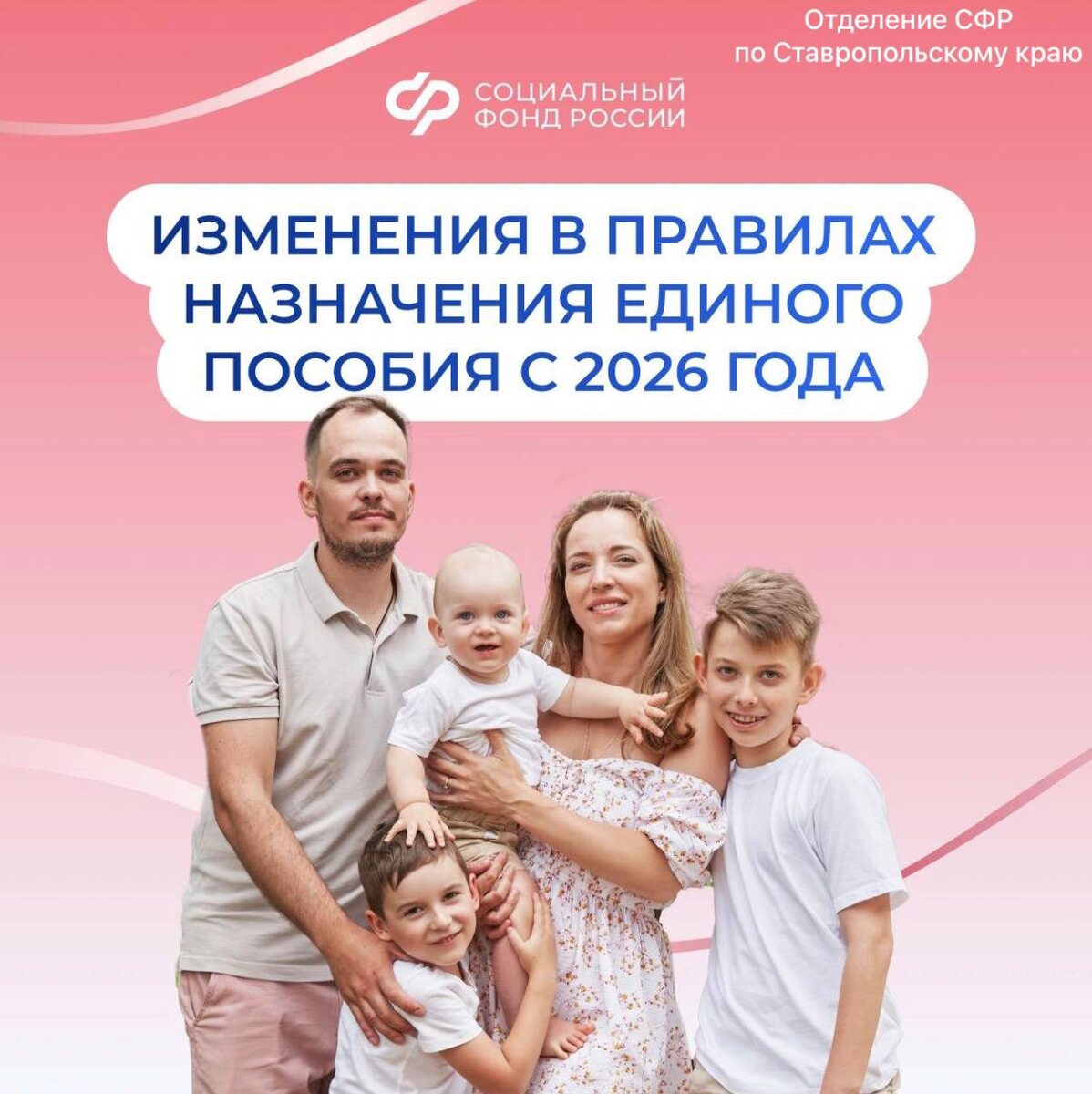 ? 👨👨👦👦 Отделение СФР по Ставропольскому краю назначает единое пособие семьям с доходом ниже прожиточного минимума в регионе (на Ставрополье - 17045 рублей) после комплексной оценки нуждаемости. 📌Выплата назначается гражданам РФ на 12 месяцев (на детей) и продлевается по заявлению. ☝️Пособие могут получать: - беременная женщина, вставшая на учет до 12 недель беременности - один из родителей (усыновителей, опекунов) ребенка в возрасте от 0 до 17 лет 📈 Каждый год эта мера поддержки индексируется и совершенствуется. Узнайте, что нового будет в правилах в 2026 году в карточках 👆 📝 Если срок вашей выплаты заканчивается в декабре, то вы уже можете подавать новое заявление: - онлайн на портале госуслуг - в клиентской службе Отделения СФР - в МФЦ Также вы можете одним заявлением синхронизировать сроки выплат на всех детей. 👉 Узнайте еще больше о едином пособии на сайте СФР. #СФР #Соцфонд #единоепособие #семьямсдетми