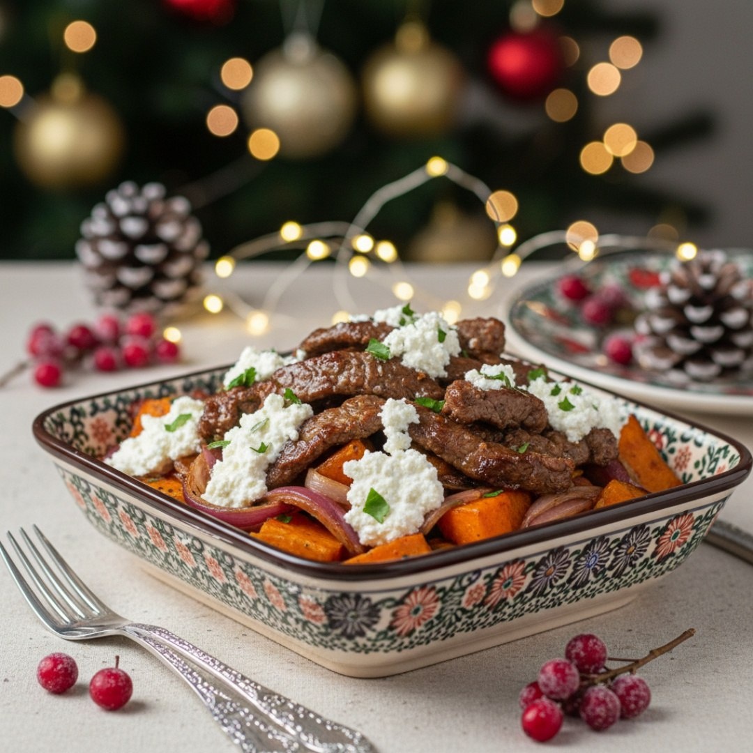 Ингредиенты ⤵️ 🔸Говяжья вырезка — 400 г 🔸Соевый соус — 2 ст. л. 🔸Мёд — 2 ст. л. 🔸Чеснок — 2 зубчика 🔸Имбирь — 1 ч. л. 🔸Перец чили — ½ ч. л. 🔸Растительное масло — 3 ст. л. 🔸Батат — 2 шт. 🔸Лук красный — 1 шт. 🔸Морковь — 1 шт. 🔸Соль, перец — 1 щепотка 🔸Творог мягкий — 150 г 🔸Сметана — 2 ст. л. 🔸Сок лимона — 1 ст. л. 🔸Зелень — 1 пучок 🔸Кунжут - 20 г Приготовление🍠 1. Говядину нарезать, замариновать в смеси соевого соуса, мёда, чеснока, имбиря, чили и масла на 20–30 мин. 2. Батат, лук, морковь нарезать, сбрызнуть маслом, посолить, поперчить. Запекать на противне при 200°C 20 мин. 3. Выложить сверху говядину, запекать ещё 10–15 мин. 4. Смешать творог, сметану, мёд, сок лайма, соль и зелень для заправки. 5. Разложить овощи с говядиной по мискам, полить заправкой, посыпать кунжутом и зелёным луком. 6. Подавать горячим. Рецепт дня #говядина #маринад #творожный_соус #зелень #праздничный_стол