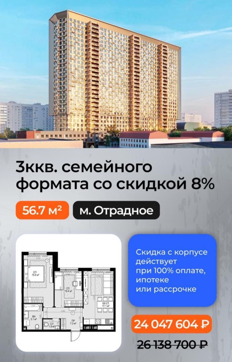 % ⚪️2Еккв. в ЖК Трилогия CRYSTAL со скидкой 5% 30 433 725 ₽ 32 035 500 ₽ ⚪️1ккв. в ЖК Театральный квартал со скидкой 5% 26 121 960 ₽ 27 496 800 ₽ ⚪️3Еккв. в ЖК Дом МАЛЕВИЧ со скидкой 8% 24 047 604 ₽ 26 138 700 ₽ Это шанс встретить следующий год уже в стенах своего нового дома 🖖 Финальная стоимость и применение скидки согласовывается индивидуально!