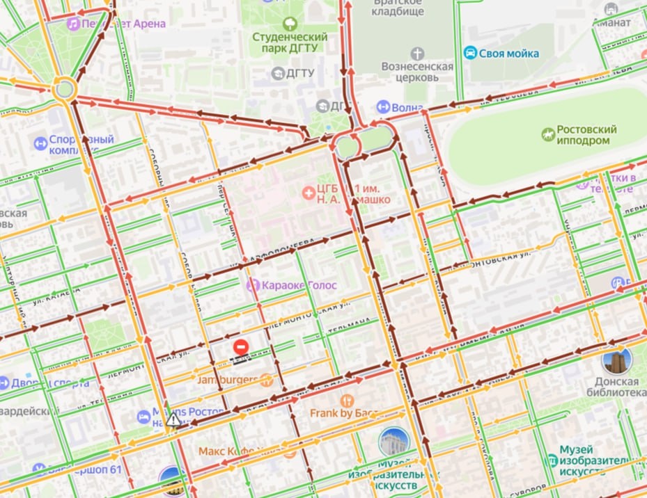 В вечерний час пик 22 декабря город сковали 8-балльные пробки. Стоит весь центр, стандартно, Большая Садовая, Красноармейская, Ворошиловский, Буденновский, Нансена и Михаила Нагибина. Ситуацию осложняют ДТП на улице Ленина и дорожные работы на Немировича-Данченко. Чем ближе Новый год, тем страшнее в конце рабочего дня смотреть карту пробок 🤯