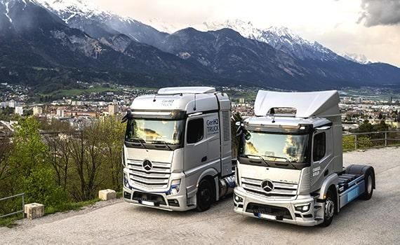 Mercedes-Benz продемонстрировал в Тироле на высотах до 1560 метров над уровнем моря 2 новых грузовика с топливным элементом на основе водорода Mercedes-Benz GenH2 и электрический Mercedes-Benz eActros 300. Доктор Далибор Дудич, руководитель проектов грузовиков Mercedes-Benz отметил этапы запуска в серию:
