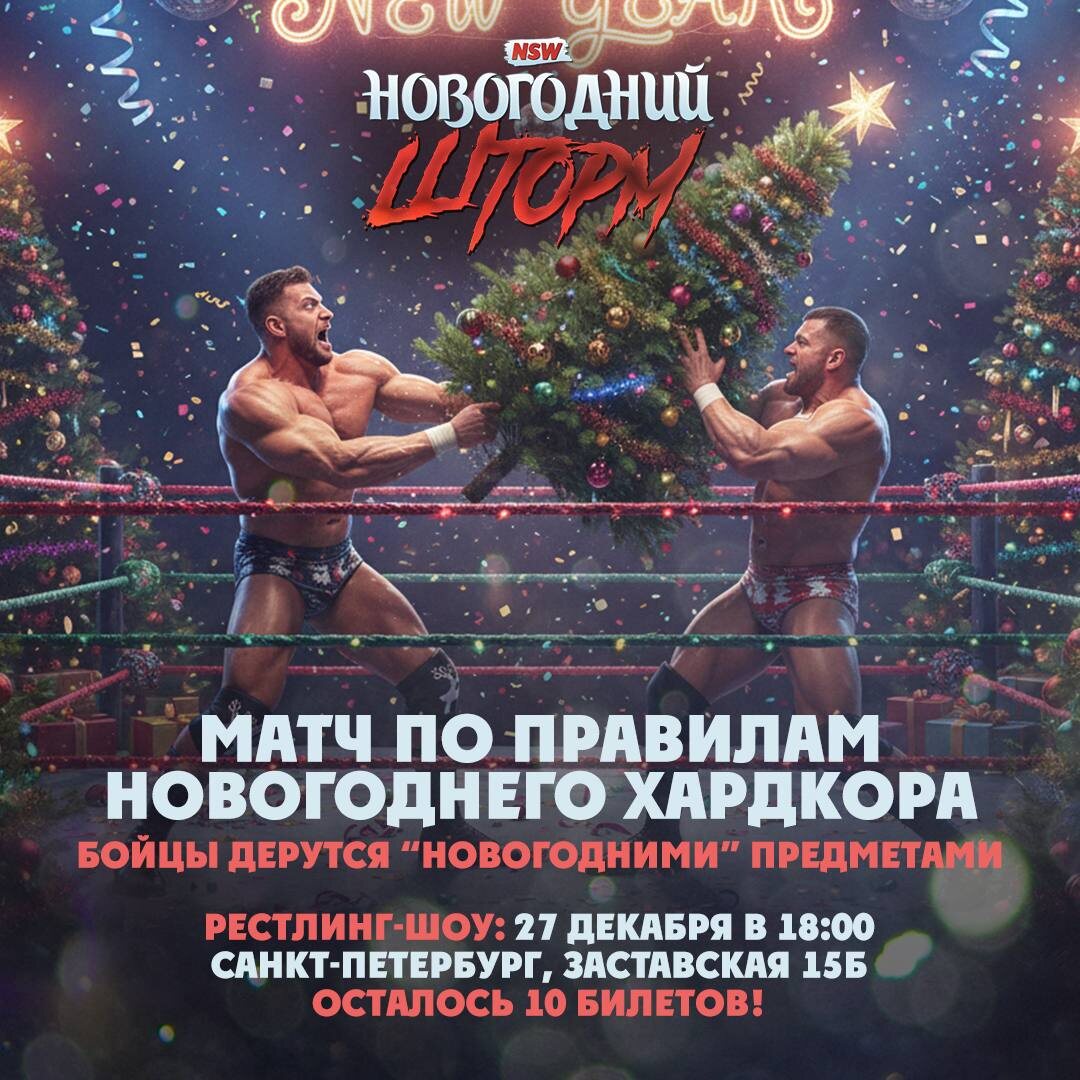 📍ОСТАЛОСЬ 10 БИЛЕТОВ: https://spb.qtickets.events/201648-nsw-novogodniy-shtorm-27-dekabrya-2025-restling Традиционное событие на праздничном шоу: матч по правилам "Новогоднего Хардкора", где в ход может пойти что угодно (ёлки, игрушки, подарки и так далее). Такое точно нужно смотреть в живую, тем более осталось совсем мало билетов, так что не пропустите специальное шоу от NSW в 2025 году. ———————————————— NSW НОВОГОДНИЙ ШТОРМ 2025 Дата: 27 декабря 2025 г. Место: База NSW Двери: 17:45 Время начала шоу: 18:00 ———————————————— По вопросам рекламы и сотрудничества - spbnorthernstorm@gmail.com