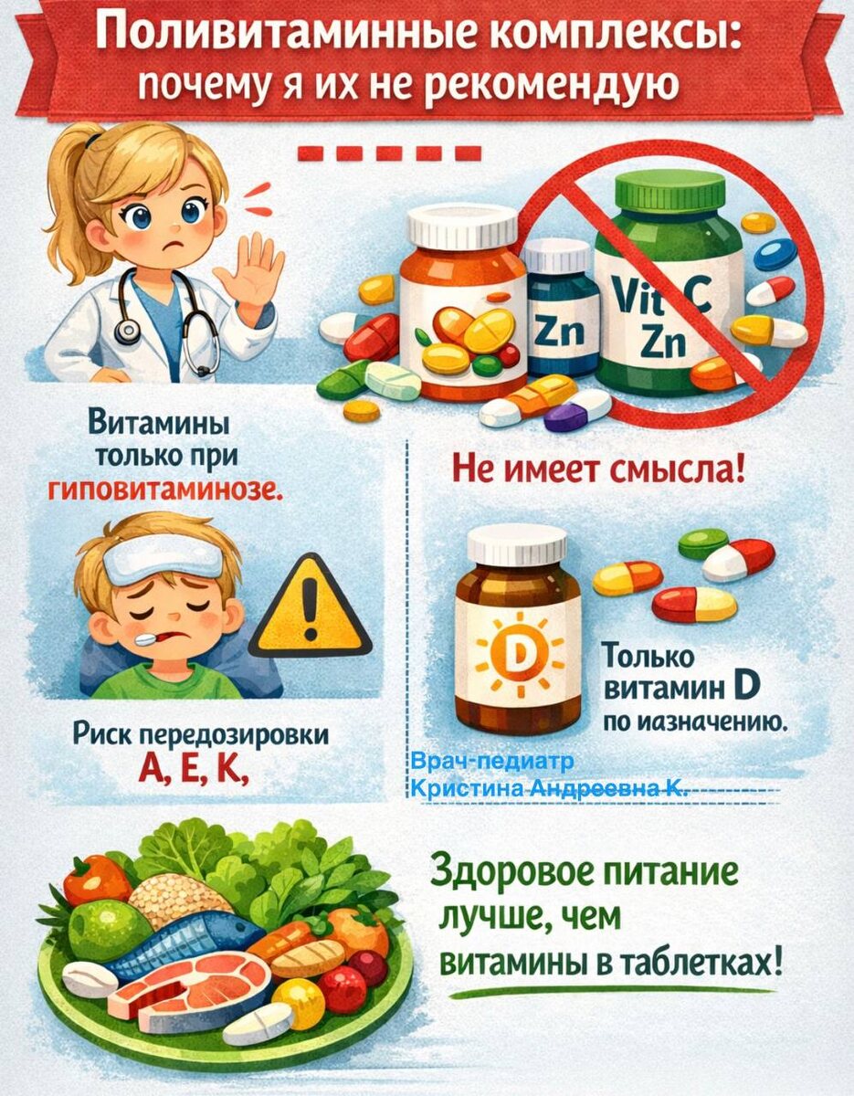 ➗➗➗➗➗➗➗➗ 💊В аптеках — огромный выбор витаминных комплексов. Фармацевты часто советуют их «для иммунитета», «чтобы ребёнок меньше болел» или «лучше ел». Да и некоторые врачи, к сожалению, тоже их назначают. ‼️Важно понимать: ➡️витамины назначаются только при гиповитаминозе. Как правило, дефицит витаминов сопровождается определёнными симптомами и подтверждается клинически. ➡️Принимать витамины «на всякий случай», для «подъёма иммунитета» — бессмысленно. Ударные дозы витамина С или цинка не ускоряют выздоровление. ⏺️При этом избыток жирорастворимых витаминов (A, E, K) быстро накапливается в организме и может приводить к побочным эффектам. ✔️Единственный витамин, который рекомендован для профилактики — витамин D, и то строго в определённой дозировке (об этом я уже писала ранее). ➡️Как именно повлияет поливитаминный комплекс на вашего ребёнка — предсказать невозможно. В лучшем случае — не будет эффекта, в худшем — появятся нежелательные реакции. 🍊Разнообразного и сбалансированного п