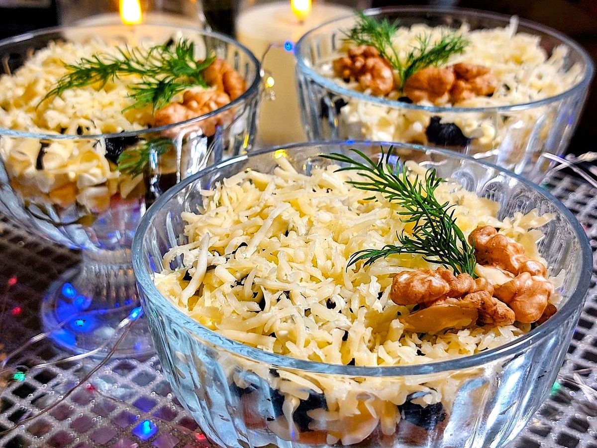 Слоёный, красивый, с насыщенным вкусом, где солёное, копчёное и сладковатое идеально дополняют друг друга. Копчёная курица, маринованные огурчики, нежный чернослив, орехи.