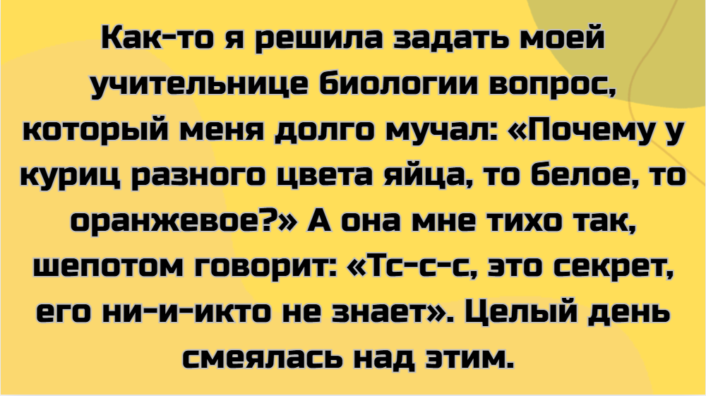 - У нас была училка, которая всегда ходила на уроки со своим загадочным термосом. Когда она была не в духе, всегда говорила: «Сейчас глотну, хоть успокоюсь». Все ломали голову: ну что там? Дорогой кофе? Травяной чай? Как-то она вышла из класса, и мы сразу побежали к ее столу, чтобы посмотреть. Друг осторожно открыл термос, и тут резкая вонь, но запах чертовски знакомый! Друг аж отшатнулся и заорал на весь класс: «Боже, да это же щи!»