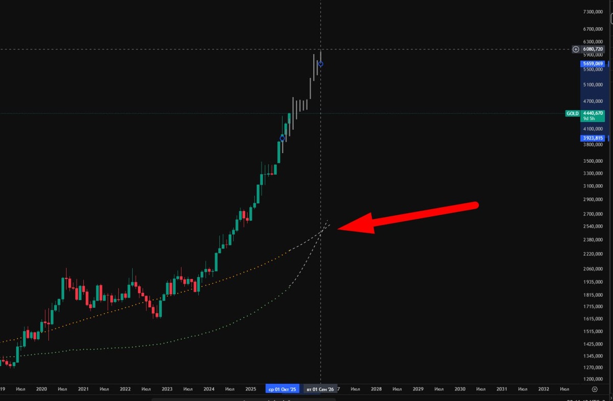Ловите смоделированный прогноз моим биокомпьютером между ушей. Там где стрелочка, пересечение скользящих. Чтоб это случилось цена должна быть около $6к за унцию в 4м квартале 2026. Не относитесь к этой отсебятене как к 100% прогнозу. Мой компуктер старый и плохо учился в школе. К тому же золото я наблюдаю просто потому что, BTC часто шёл за ним.