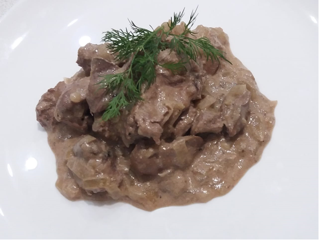 Ингредиенты: - любая печень – 500 гр.; - лук репчатый – 2 штуки; - сметана – 180-200 гр.; - соль – по вкусу; - перец черный молотый – по вкусу; - растительное масло – примерно 30 мл. На глубокую сковороду или казан с включенным нагревом немного меньше среднего добавить растительное масло, мелко нарезанный репчатый лук, промытую, нарезанную печень, сразу добавить по вкусу соль, перец, накрыть крышкой. Как только лук начнет немного поджариваться, а сметана расплываться, перемешать, тушить под закрытой крышкой 20 минут периодически помешивая. Если гуляш получатся жидковатым нужно добавить 0,5-1 чайную ложку муки, перемешать или муку смешать с небольшим количеством воды, добавить к печени с луком перемешать, тушить в течении одной минут помешивая. Приятного аппетита.