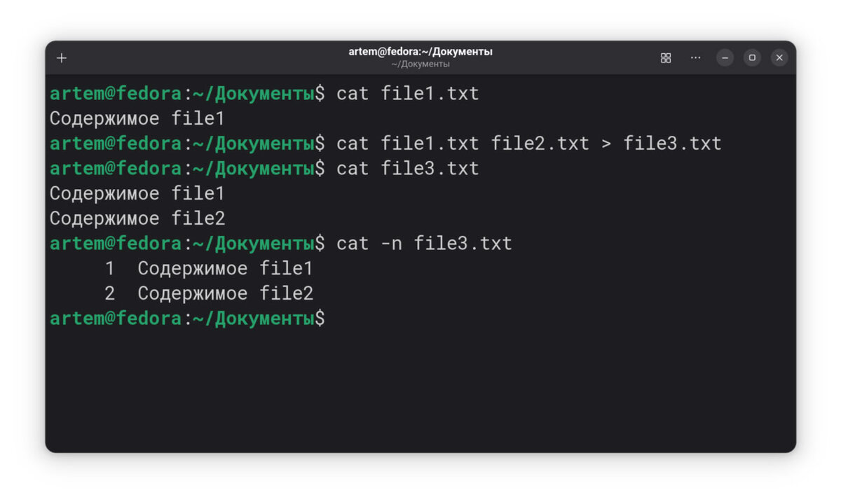 cat (от concatenate – соединять) – простая утилита для вывода содержимого файлов и их объединения. Незаменима для работы с текстом в терминале. cat [файл1] [файл2] ... Укажите один файл – увидите его содержимое. Несколько – увидите объединенными. -n – нумерует все строки. -b – нумерует только непустые строки. -s – сжимает пустые строки. -v – показывает невидимые символы. Вывод файла: cat file1.txt Объединение файлов: cat file1.txt file2.txt > file3.txt Вывод с нумерацией: cat -n file3.txt Для небольших файлов cat – отличный выбор. Для больших – используйте less или tail. cat – универсальный инструмент для работы с текстовыми файлами. Простая, но мощная утилита для быстрого просмотра и объединения данных в терминале Linux. Жду ваших комментариев! Поставьте лайк, если хотите видеть больше интересного контента. До скорой встречи!
