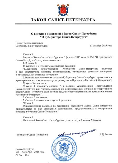 Новый закон о зарплате губернатора Петербурга официально опубликовали