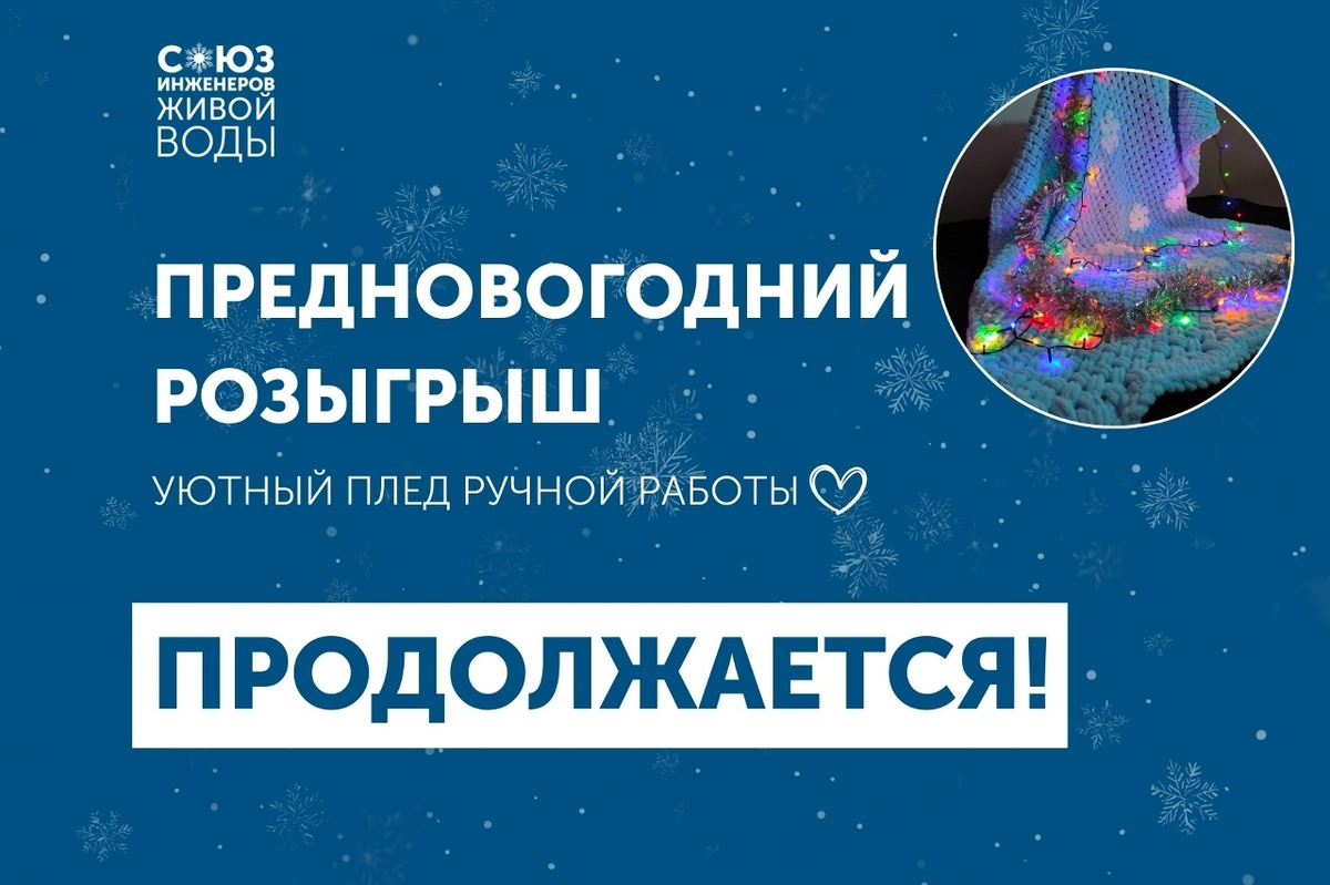 Всего 8 дней до финала предновогоднего розыгрыша! А вы участвуете? Напоминаем, что приз в этом году — плюшевый мягчайший плед в цветах Союза Инженеров Живой Воды с узором из снежинок. Можно использовать в качестве покрывала, можно подарить, а можно укутаться в него, обложиться книгами и не вылезать до конца новогодних праздников 😎 Для участия необходимо Быть участником нашего сообщества; Включить уведомления от сообщества о новых публикациях (нужно нажать на три точечки или "еще" в версии для компьютера, а потом на колокольчик, чтобы появилась "галочка"; Сделать скриншот (можно фотографию экрана) и прислать его вместе со словом "участвую" в комментарии к этому посту; Поставить посту лайк и сделать его репост на свою страницу. Выберем победителя случайным образом 30 декабря, будет запись. Вот так] это происходило в прошлом году. А [https://vk.com/wall-211185129_1348|вот так происходила распаковка приза в прошлом году. Готовы проверить свою удачу?