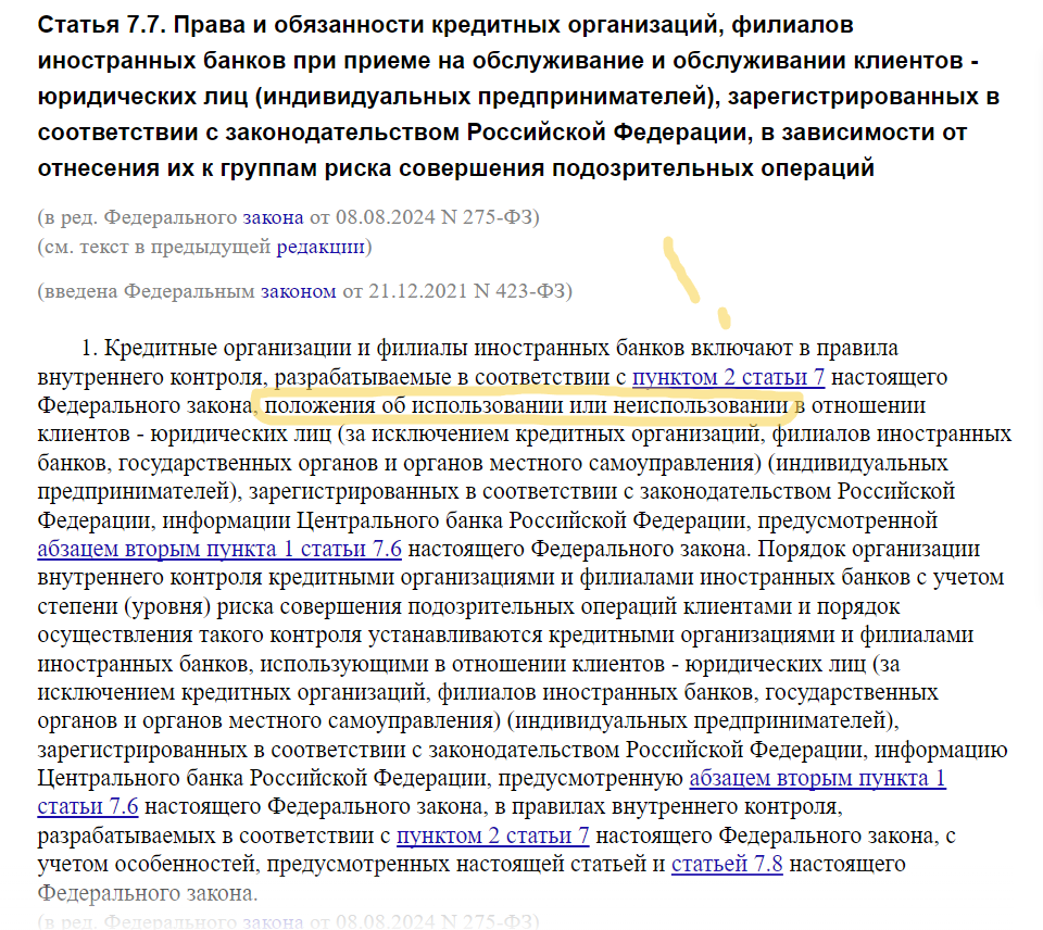 То есть, банки в своих правилах ВНУТРЕННЕГО контроля (эти правила не распространяются на соблюдение их клиентами) прописывают дополнительные ПОЛОЖЕНИЯ о ПРИМЕНЕНИИ или НЕПРИМЕНЕНИИ критериев ЦБ РФ.