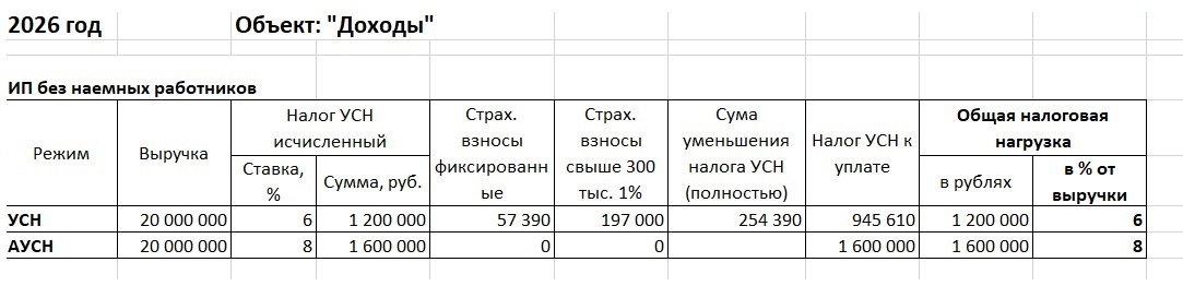 Поэтому для ИП без работников смысла переходить на АУСН для экономии на страховых взносах однозначно нет, он только увеличит свою налоговую нагрузку с 6 до 8%: