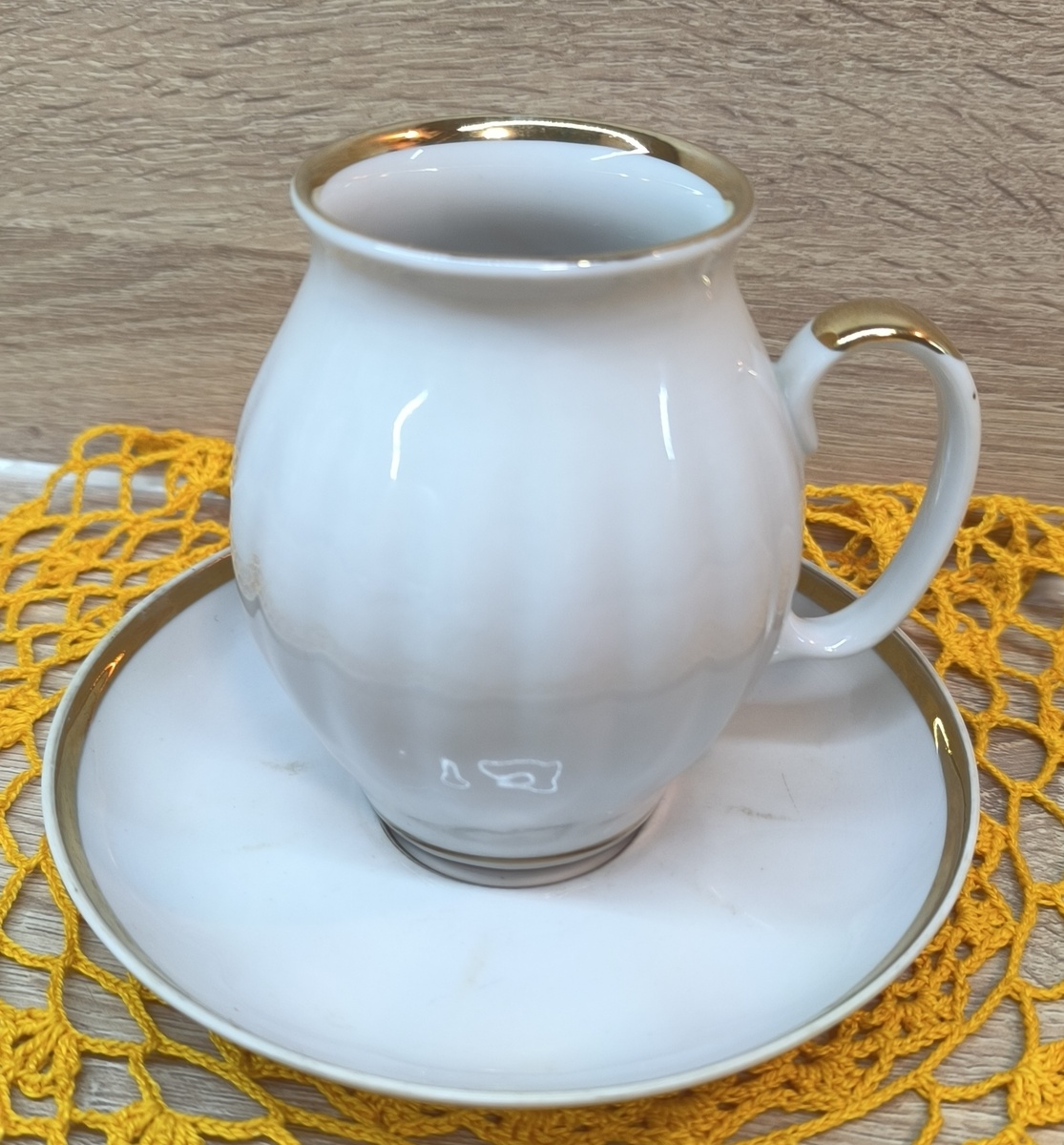 Рада приветствовать, Вас на моем канале. Хочу сегодня показать, Вам свою новую новинку. Белый молочник с золотой полоской из легкого белоснежного фарфора. Легендарная форма чайного сервиза "Белый лебедь" , рисунок «Московский». Создана форма сервиза, скульптором посудных форм О. М. Мухигули, была в 1968 году на знаменитом Дулевском фарфоровом заводе имени газеты «Правда». Молочник белый прозрачный обтекаемый с дольчатыми переходами, первый сорт. И ещё от набора чайных пар "Тюльпан" осталось, только блюдечко с золотой каемочкой. Клеймо синее «Сокол» 1987 года 2й сорт. Очень хорошо смотрится в компании с сахарницей Хайтинского фарфорового завода из Сибири. Тонкий золотой ободок скромно украшает снаружи чашки ЮФЗ, а внутри более широкая позолота. Чашки приземистой формы идеально сочетается с дольчатым молочником. Нарядно и просто можно сказать в одном стиле, собирается компания "единомышленников". И новенький молочник очень хорошо вписывается в этот коллектив. Хайта - Вербилк