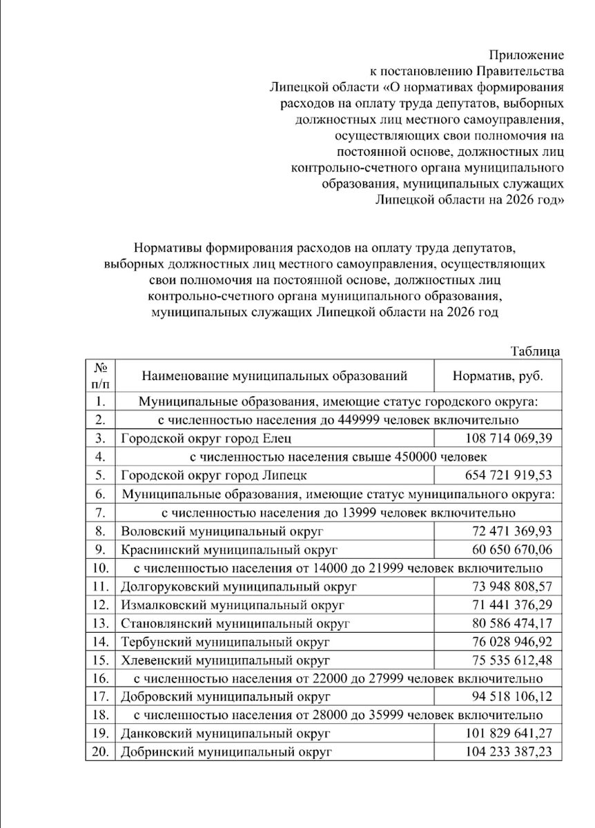 Игорь Артамонов подписал два постановления правительства Липецкой области, регламентирующие нормативы на оплату труда депутатов, выборных должностных лиц местного самоуправления на постоянной основе и контрольно-счетного органа, а также муниципальных служащих региона на 2026 год. Первый документ утверждает методику расчета по формулам, исходя их численности населения. Судя по нему, в норматив не включаются расходы на заплату муниципальных служащих, которые содержатся за счет субвенций, межбюджетных трансфертов или дотаций. Второй документ определяет, непосредственно, распределение средств по муниципальным образованиям. По подсчетам журналиста «Площади», общая сумма составляет 2,116 млрд рублей. Самая крупная часть в 654,72 млн рублей направлена на городской округ Липецк (численность населения более 450 тыс. человек). Елец попал в категорию до 449,9 тыс. человек – чиновники и депутаты могут рассчитывать на 108,7 млн рублей. Еще 95,76 млн рублей уйдет на Елецкий муниципальный округ. Боле