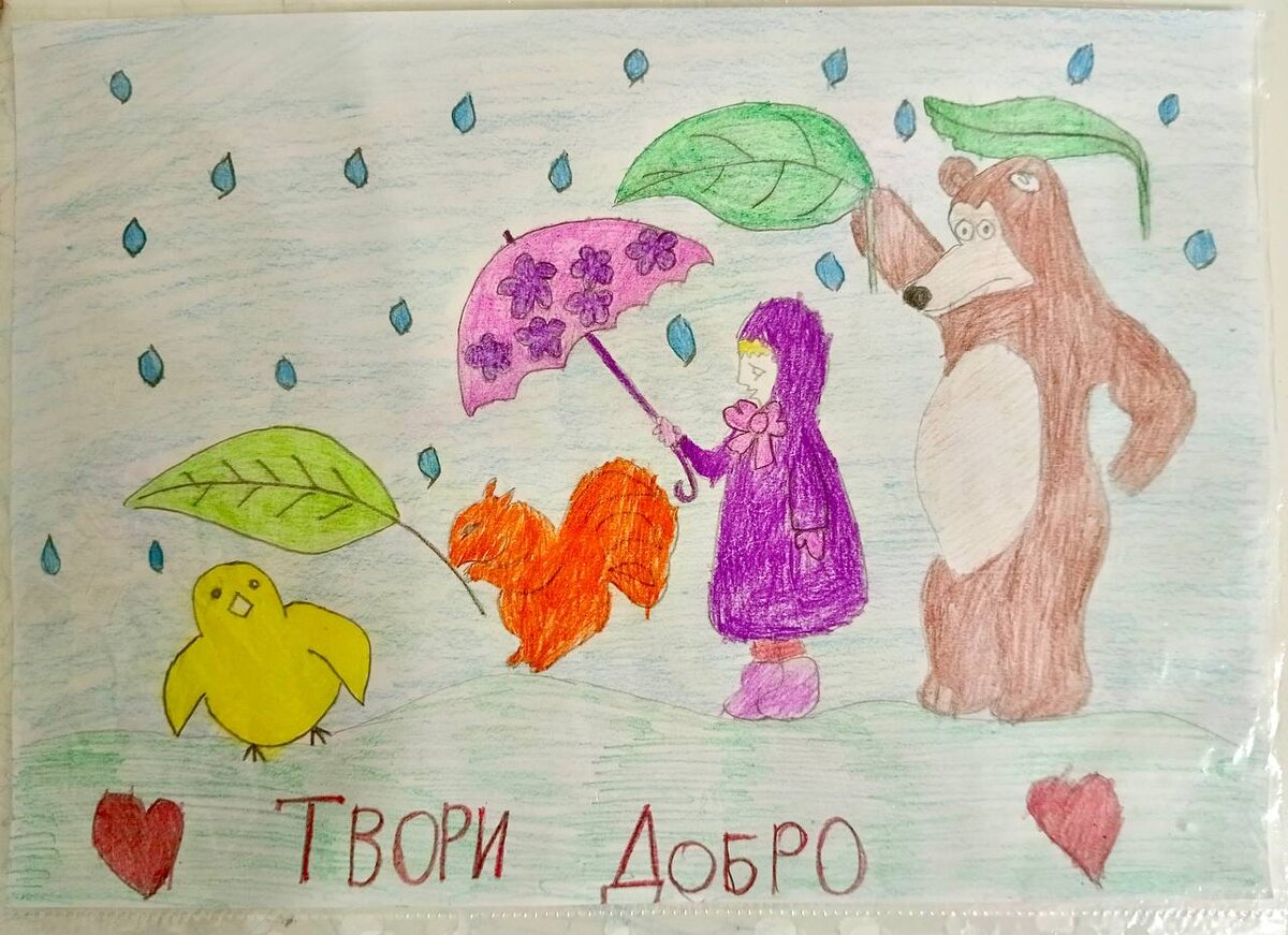В преддверии своего юбилея Фонд «Круг добра» объявил конкурс детского рисунка «Я рисую доброту». Родителям подопечных детей Фонда мы предложили обсудить с ребятами важную тему: как они понимают доброту, как ее видят и как именно могли бы её выразить в рисунке. Здорово, что тема конкурса мгновенно всколыхнула десятки семей наших подопечных, проживающих во многих регионах нашей огромной страны! Дорогие ребята! Уважаемые родители наших подопечных! Вы прислали очень яркие и трогательные рисунки, которые нам, сотрудникам Фонда, было очень интересно рассматривать и обсуждать! Огромное спасибо за ваше участие в конкурсе, за талант ваших детей и особенно за то, что вы, родители, находите время, чтобы говорить с детьми о смысле доброты! По итогам достаточно жаркого голосования мы, как и обещали, объявляем победителя конкурса «Я рисую доброту». Ею стала: На наш взгляд, ее рисунок максимально точно отражает понятие доброты и взаимопомощи – на примере сказочных персонажей. Арине Гавриловой 7 лет,