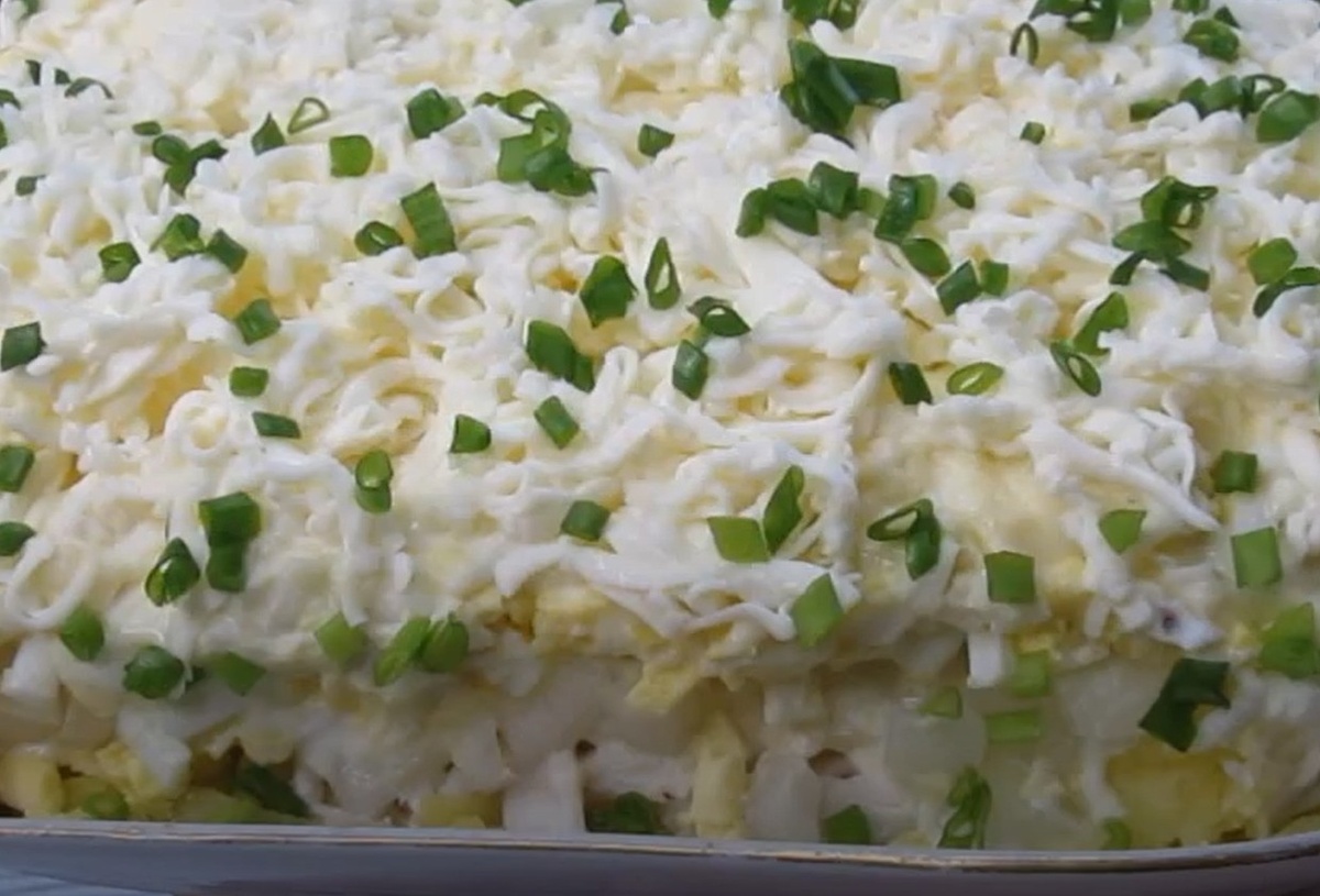 7. Далее сверху на крупной терке натираем варенные яйца, сверху майонез.