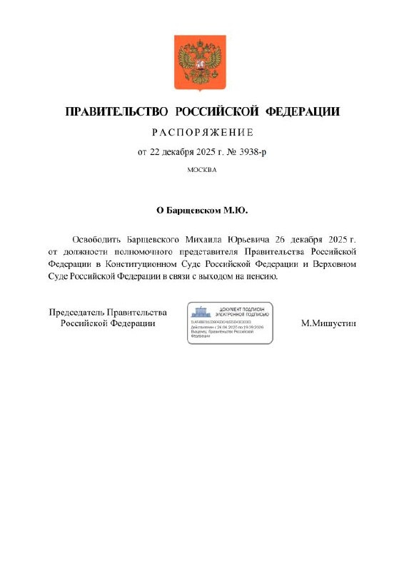 📝Председатель Правительства РФ освобождает от должности полпреда правительства РФ в КС и ВС Михаила БАРЩЕВСКОГО 26 декабря 2025 г