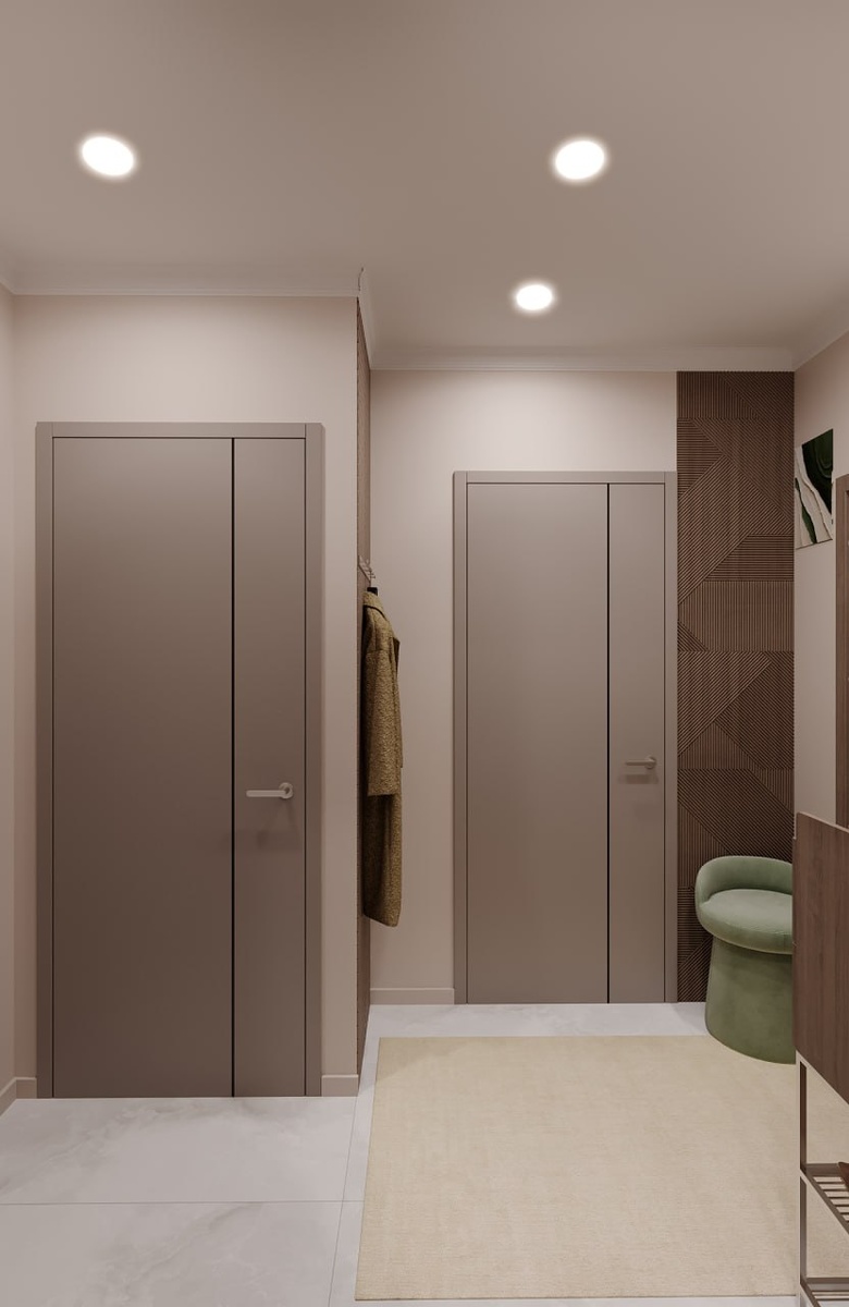 В нашем проекте #Комарова57 готовы визуализации коридора — интерьер получается современный, нейтральный и очень спокойный: светлая база