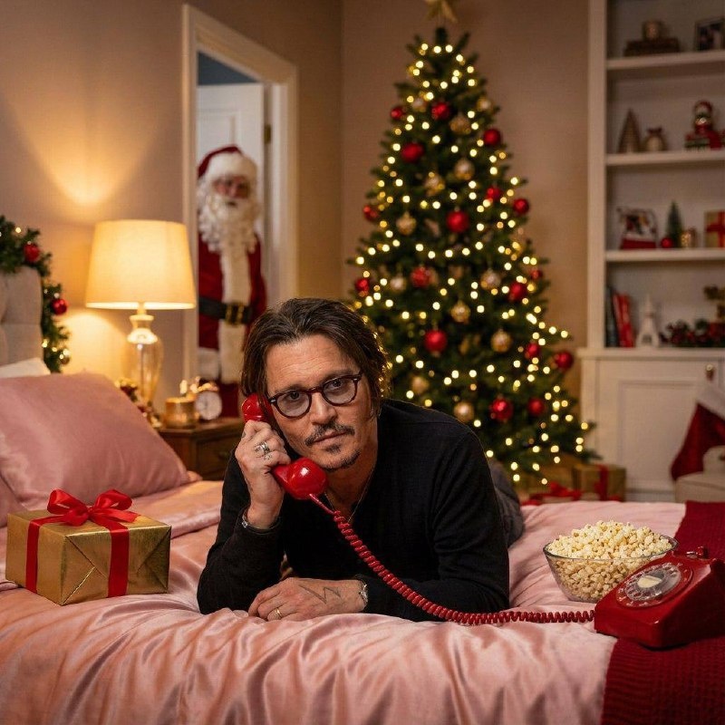 Прикрепляем свое фото к запросу (копируется нажатием): Фотореалистичная рождественская фотосессия в уютной спальне: персона с фото (женщина/мужчина, лицо сохранено 1 в 1) лежит на кровати на розово-сатиновом покрывале, смотрит в камеру, держит у уха красную ретро-трубку проводного телефона, рядом на переднем плане подарок в золотой упаковке с красным бантом и миска попкорна. На заднем плане высокая новогодняя ёлка с тёплыми гирляндами и красными шарами, мягкий боке от огней. В дверном проёме слегка размытый Санта-Клаус как забавная деталь сюжета. Тёплый домашний свет, лампа на тумбочке, мягкие тени, уютная атмосфера, праздничный декор на полках. Камера: 50mm, f/1.8, shallow depth of field, cinematic lighting, ultra realistic, high detail, natural skin texture, clean composition, magazine editorial photo, warm color grading, vertical portrait. NeuroFlux #новогоднеефото #ДедМороз #рождественскаяфотосессия #фотореализм #уютнаяатмосфера #праздничныйдекор #кинематографическоеосвещение #п