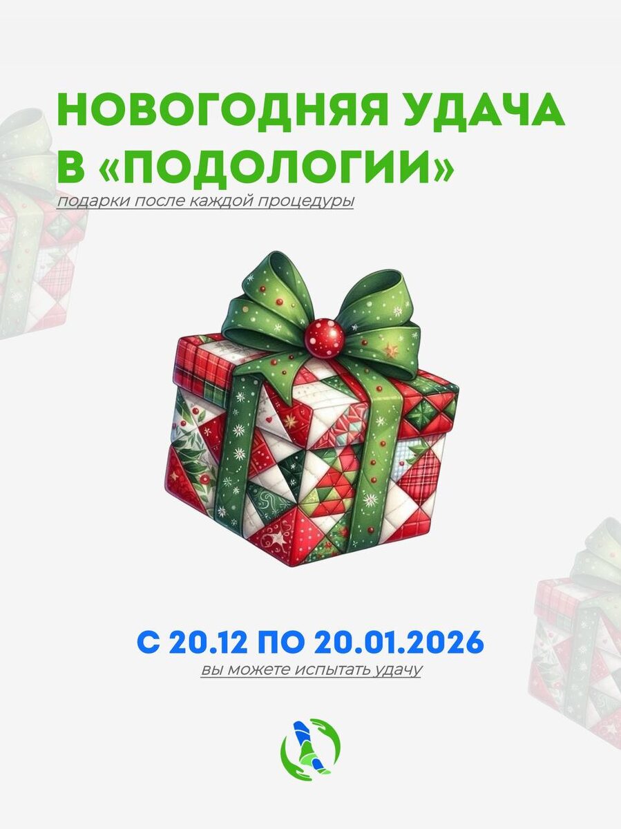 🎁 — в честь приближающегося Нового года мы запускаем акцию, в которой вы можете попытать свою удачу Условия участия: 🔵подписка на наш телеграм канал 🔵средний чек превышает размер, установленный под каждый филиал отдельно (уточняйте у администратора) Мы стремились, чтобы это мероприятие смогло принести пользу вам и вашим близким в 2026 году, поэтому добавили в призы от бесплатных процедур до премиальных товаров, которые есть у нас в продаже Делитесь, уже успели поучаствовать? Или только планируете визит к нам? Сделайте проще свою подготовку к праздникам уже сегодня! 🍃⤵️ по номеру: +7(495)432-01-20 в бот: @podologclinic_bot