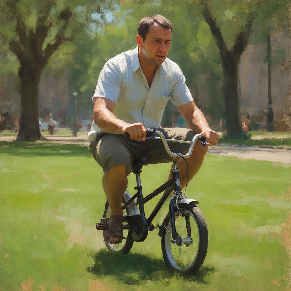 Ну а обратно папенька, вспомнив детство, лихо прикатил на «Школьнике» сам, выгнув коленки по сторонам, ну понимаете.