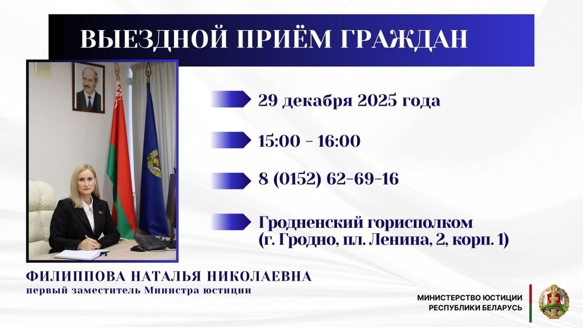 🗓 29 декабря 2025 года с 15:00 до 16:00 первый заместитель Министра юстиции Республики Беларусь Наталья Филиппова проведет выездной прием