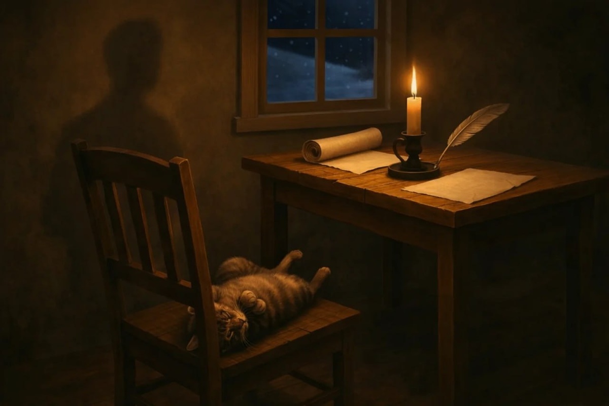 Ветер, как обычно, принёс с Невы не сырость даже, а некую водяную пыль. Она оседает на стёклах, за которыми уже не сумерки, а та плотная, почти осязаемая темень, что является ночью в городе, лишённом звёзд. Город, впрочем, и сам — созвездие разбитых надежд и геометрических перспектив, упирающихся в ничто. Я зажигаю свечу. Не от страха, а чтобы тень моя, уродливая и послушная, металась по стенам этой клетки, — так душа, привязанная к телу, мечется в его пределах. На столе — бумага, перо, бутылка чернил, более густых, чем эта ночь. Стол деревянный, с выбоинами и пятнами, хранящими память о стаканах, книгах, локтях. Это мой алтарь. Алтарь атеиста. На нём нет ликов, нет золочёных окладов. Его святыни — пустота, которая ждёт слова, и совесть — единственный камертон в хаосе бытия. Моя религия не имеет молитв, у неё лишь одна заповедь: жить так, чтобы тень твоя не отворачивалась от тебя по утрам. Со стула, с тихим шуршанием, спрыгивает она. Кошка полосатая, как зебра, но зебра — узник саван