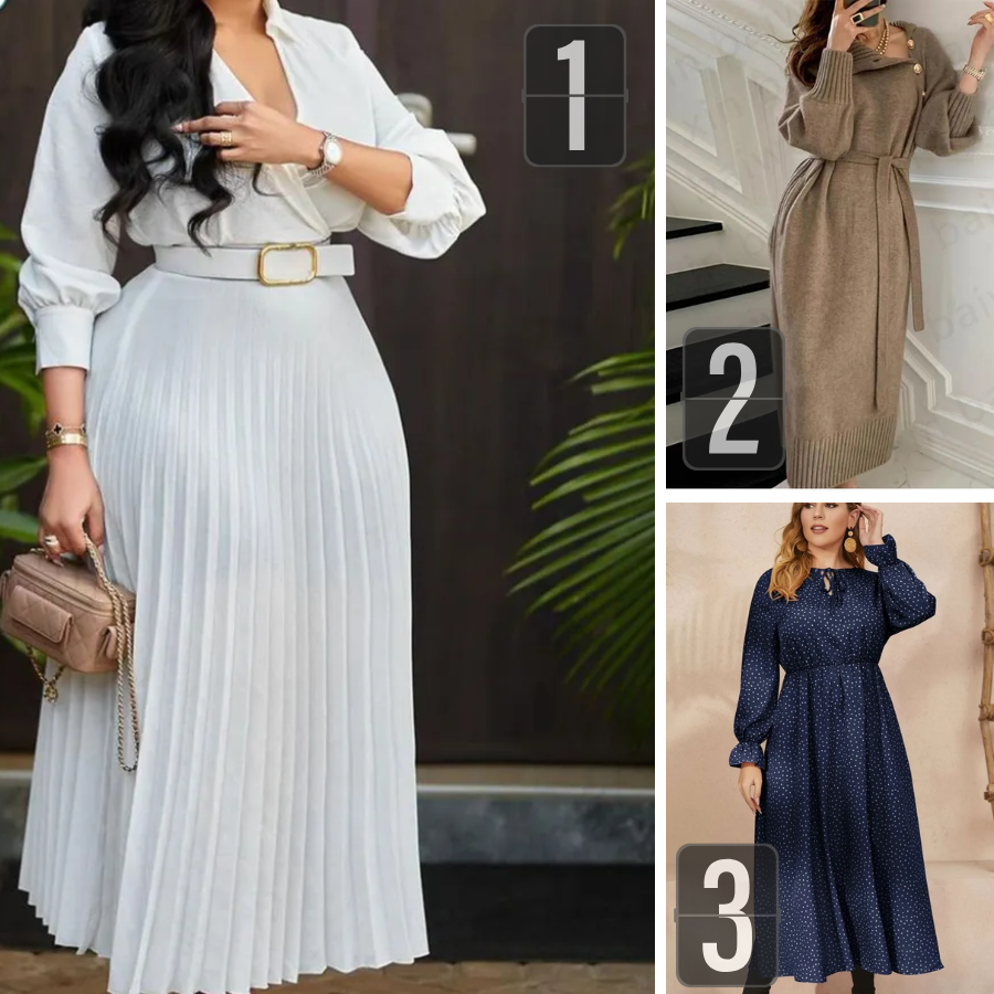 1. Платье-рубашка с плиссировкой. Это мой личный фаворит. Во-первых, верх с V-образным вырезом. Во-вторых, плиссировка. Она вытягивает рост и съедает лишние сантиметры. В комплекте идет пояс, так что талию мы подчеркнем.